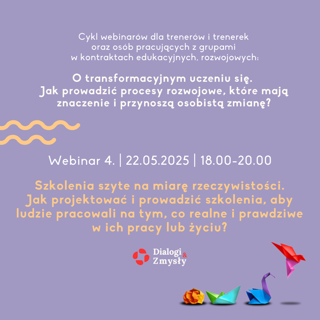 Webinar: „Szkolenia szyte na miarę rzeczywistości. Jak projektować i prowadzić szkolenia, aby ludzie pracowali na tym, co realne i prawdziwe w ich pracy lub życiu?” 22 maja 2025