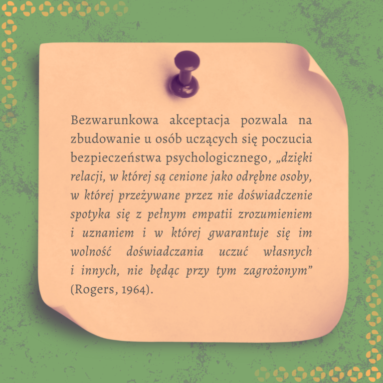 Rozważając tworzenie przyjaznej przestrzeni uczenia się w wymiarze psychologicznym warto sięgnąć do rogeriańskiej koncepcji bezwarunkowej akceptacji wobec osób uczących się. C. Rogers (1957) rozumie ją jako niestawianie warunków dla akceptacji, pozbywanie się przeświadczenia, że osoba ucząca się powinna uosabiać pożądane przez nas cechy, by można ją lubić, szanować, akceptować. To oznacza dbanie o uczestniczkę, uczestnika procesu edukacyjnego, ale nie w sposób zaborczy albo taki służący zaspokojeniu własnych potrzeb edukatorki, edukatora, ale jak o odrębną jednostkę, z przyzwoleniem na posiadanie przez nią własnych uczuć, przeżyć, doświadczeń.